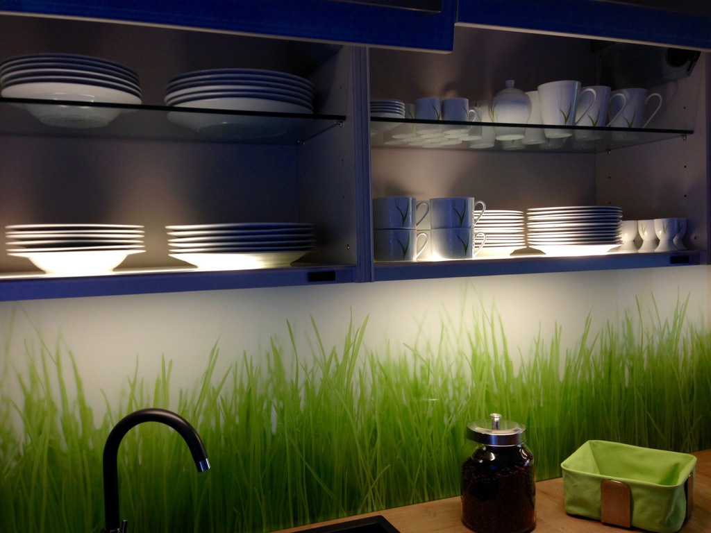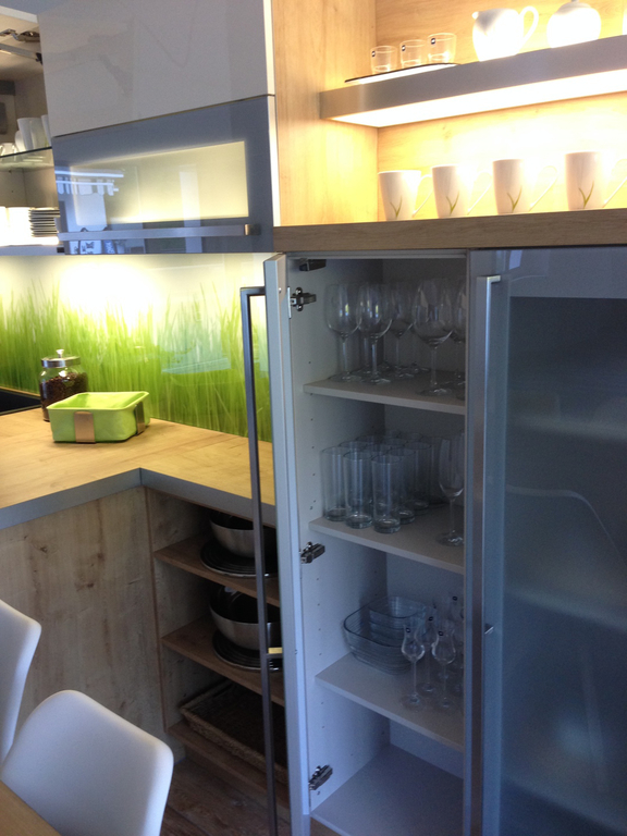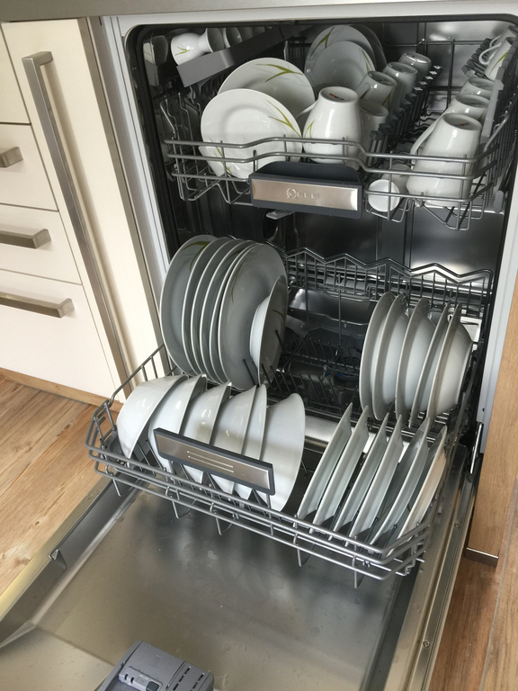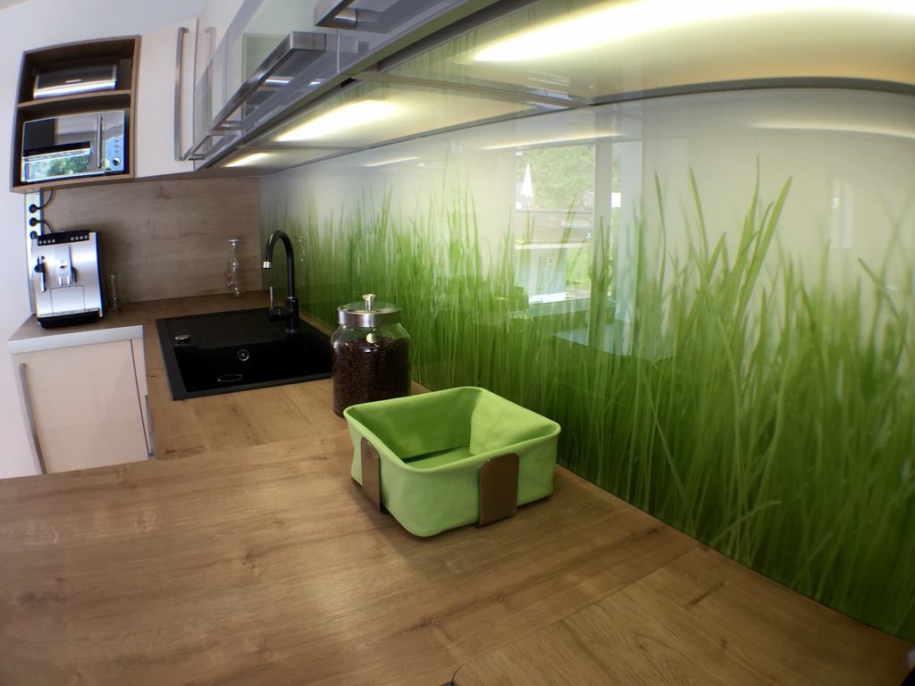 Modern gestaltete Küche mit Geschirrspüler, Backofen, Mikrowelle, Kochinsel, Brotmaschine, Geschirr und Wohnraum mit großzügiger Wohnlandschaft mit TV und integrietem Bett für 2 Personen auf