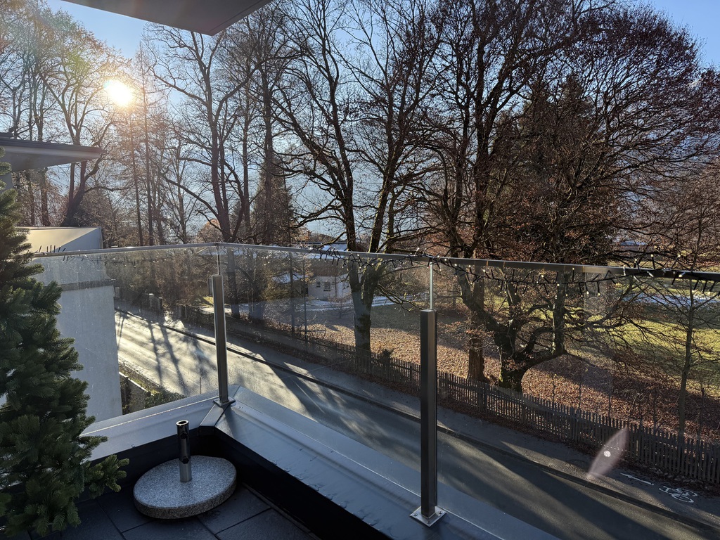 Überdachter Balkon mit Teakholzmöbel Blick auf See
